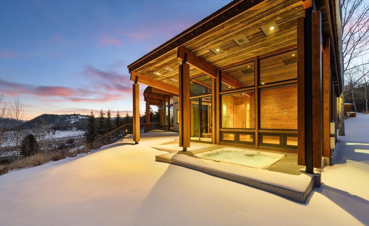 This stunning mountain modern covered patio seamlessly blends indoor luxury with outdoor alpine vistas, featuring warm honey-toned wood ceiling and beam construction paired with black metal framing and a built-in hot tub set into the concrete floor. The expansive floor-to-ceiling glass walls and pristine snow-covered landscape beyond create an editorial-quality space that exemplifies high-altitude resort sophistication with minimalist elegance.