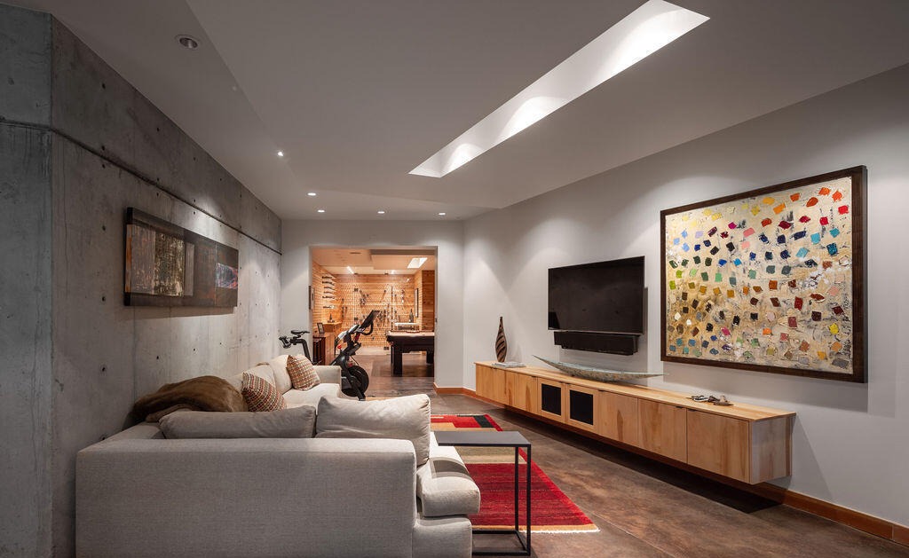 A sophisticated home theater with seamless organic modern design, featuring a concrete accent wall paired with warm natural wood cabinetry, recessed linear lighting, and a vibrant abstract artwork. The space balances minimalist restraint with genuine luxury through high-quality materials, open sightlines to an adjacent warm-toned living area, and meticulous attention to proportions and lighting.