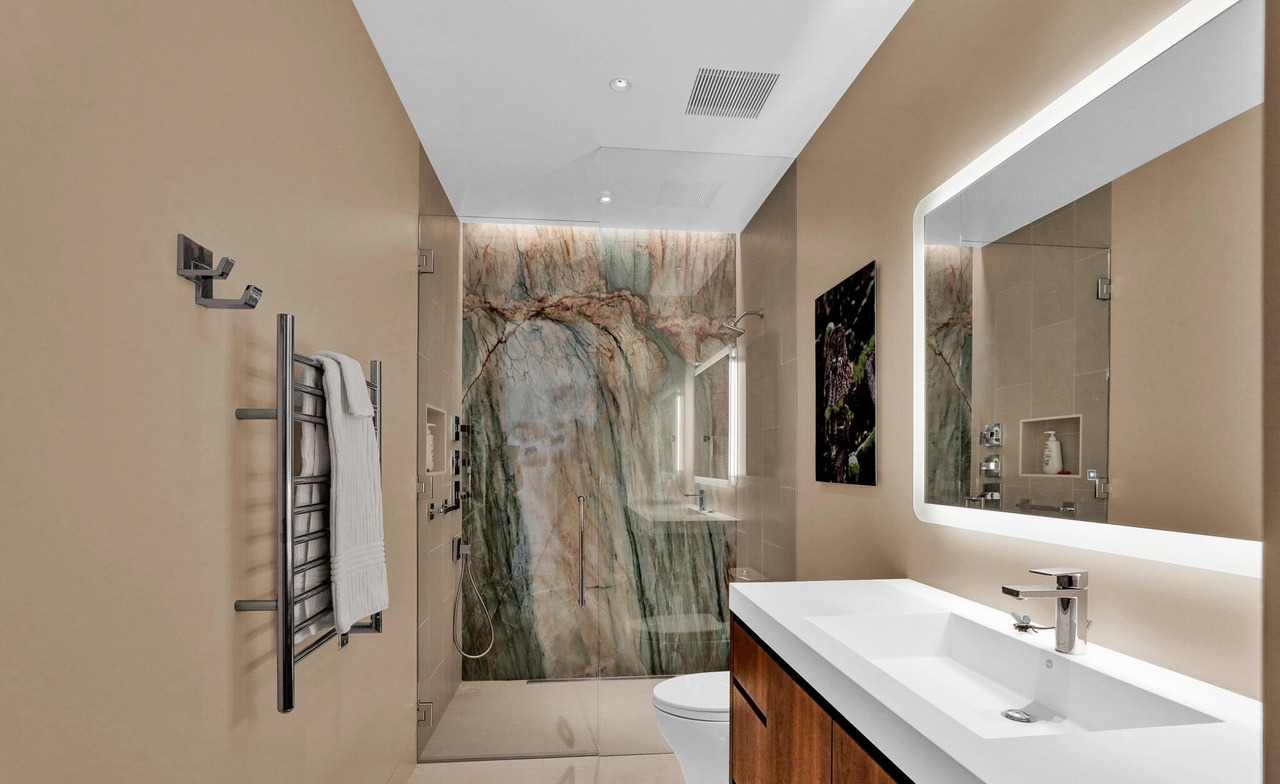 Walk In ShowerFrameless Glass Shower EnclosureFloating VanityDouble SinkStatement MirrorHeated Towel RackRecessed LightingLed Mirror SurroundArtisan Shower Wall MuralNiche Storage