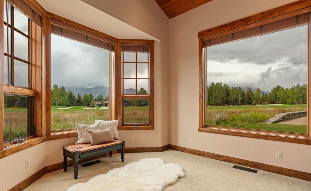A stunning mountain-view library or sitting room featuring expansive floor-to-ceiling wood-framed windows showcasing dramatic alpine scenery, complemented by warm natural wood architectural details, vaulted ceilings, and cream-toned walls. The space combines organic materials with modern minimalist furnishing to create a serene, light-filled retreat designed for contemplation and panoramic landscape enjoyment.