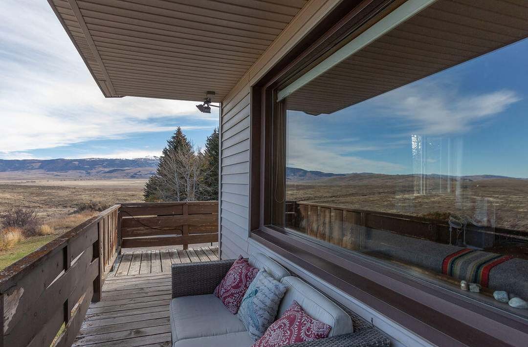 A stunning elevated mountain patio featuring expansive floor-to-ceiling windows framing breathtaking panoramic valley and mountain vistas, with warm wood plank ceilings and natural wood decking creating an inviting retreat. Furnished with comfortable outdoor seating, the space seamlessly blends the indoor comfort of the cabin with the dramatic natural landscape, exemplifying modern mountain living at its finest.