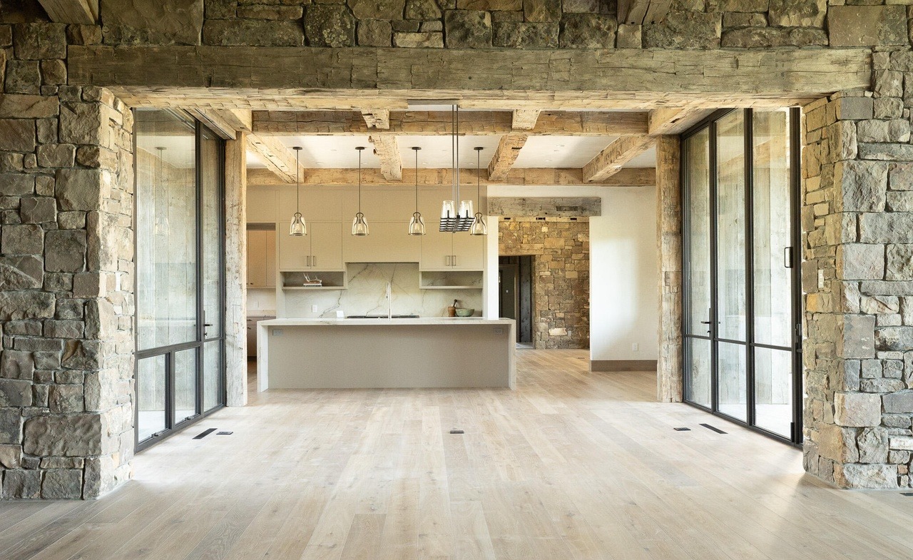 Open ConceptIslandExposed BeamsPendant LightingHigh CeilingsStone Exterior WallsFloor To Ceiling WindowsStatement Lighting
