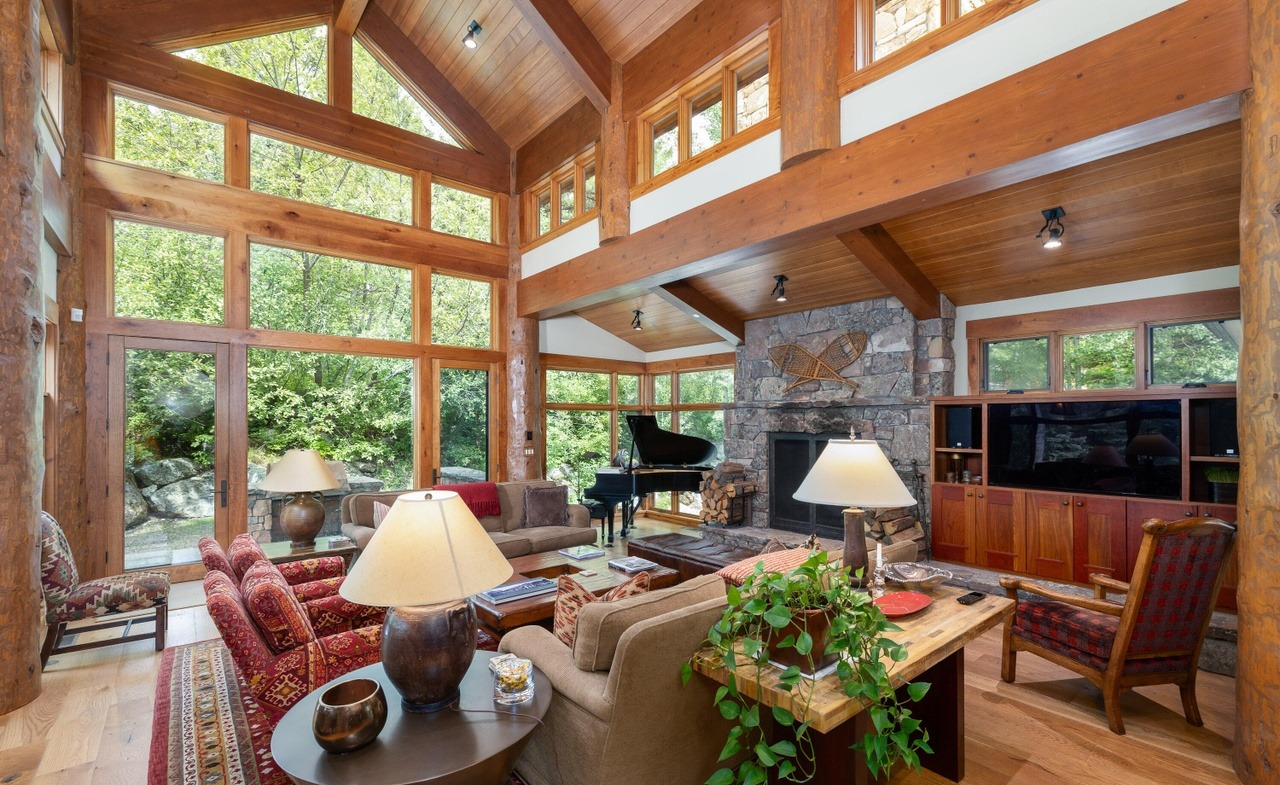 A spectacular mountain modern great room featuring soaring cathedral ceilings with exposed timber beams, abundant glazing framing verdant forest views, and a dramatic stone fireplace anchoring the space. The warm wood tones, layered seating, black grand piano, and carefully curated furnishings create an inviting yet refined sanctuary that seamlessly bridges indoor-outdoor living.