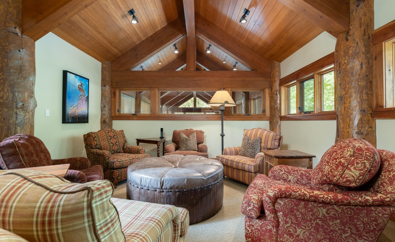 A stunning mountain-modern great room featuring soaring timber-frame architecture with cathedral ceilings, exposed structural beams, and skylighting that floods the space with natural light. The warm palette of rust, burgundy, and cream upholstery is layered across custom seating arrangements anchored by a dramatic leather ottoman, creating an inviting, sophisticated retreat with impeccable craftsmanship.