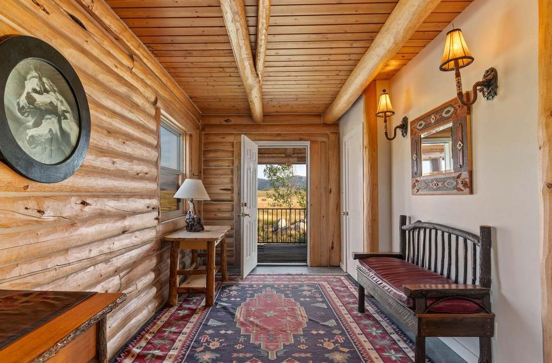 This stunning mountain lodge hallway features hand-hewn log construction with exposed ceiling beams, creating an authentically rustic yet refined corridor that opens to expansive scenic vistas. The warm wood tones, artisanal textiles, brass fixtures, and carefully curated Western artwork exemplify sophisticated mountain modern design with luxurious restraint.