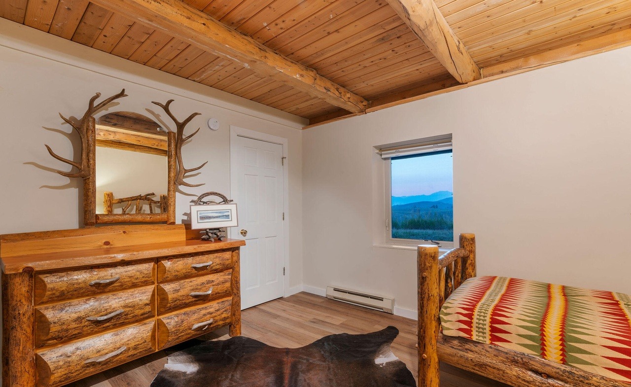 A sophisticated mountain retreat bedroom featuring exposed timber beams, rustic log furniture, and expansive windows framing stunning alpine lake and forest views. The space balances authentic cabin character with refined luxury through warm wood tones, a striking antler-framed mirror, and traditional woven textile accents.