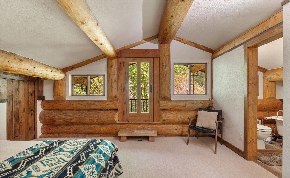 A stunning mountain modern primary bedroom suite featuring substantial hand-hewn log beams and walls paired with white drywall ceilings and contemporary glass doors and windows, creating a striking contrast between rustic craftsmanship and modern elegance. The space combines cozy lodge warmth with sophisticated design, evident in the geometric patterned bedding, modern black-framed furnishings, and expansive natural light from multiple windows overlooking forested terrain.