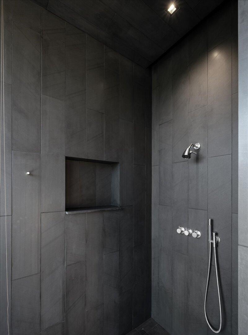 A sophisticated minimalist shower enclosure clad in large-format charcoal tile with integrated chrome fixtures, creating a dramatic monochromatic spa-like retreat. The restrained palette and precision engineering exemplify contemporary luxury bathroom design with an emphasis on clean lines and understated elegance.