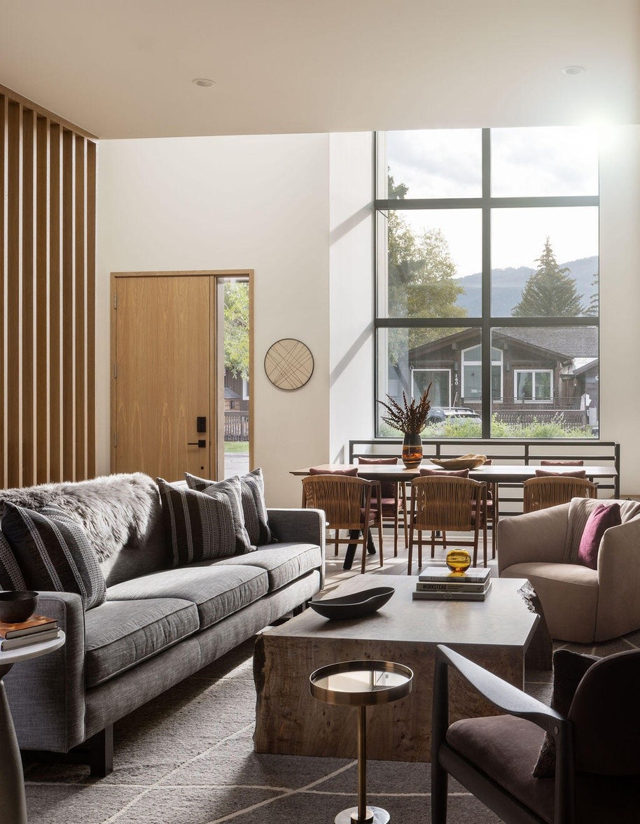 A serene mountain-view living room combining organic modern and transitional design with abundant natural light from floor-to-ceiling gridded windows and a sculptural vertical wood-slat accent wall. Warm neutral furnishings—layered linens, walnut-toned seating, and natural wood dining chairs—create sophistication balanced with welcoming comfort, while an elevated dining area and custom millwork enhance the space's refined mountain contemporary aesthetic.