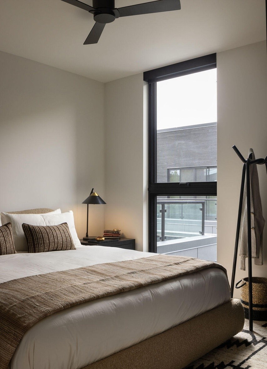 A serene primary bedroom featuring floor-to-ceiling windows with sophisticated layered shading and balcony access, combining warm neutral tones with black metal accents for a refined organic-modern aesthetic. The space balances minimalist restraint with tactile natural materials—linen bedding, woven textures, and warm wood furniture—creating an airy yet intimate luxury retreat.