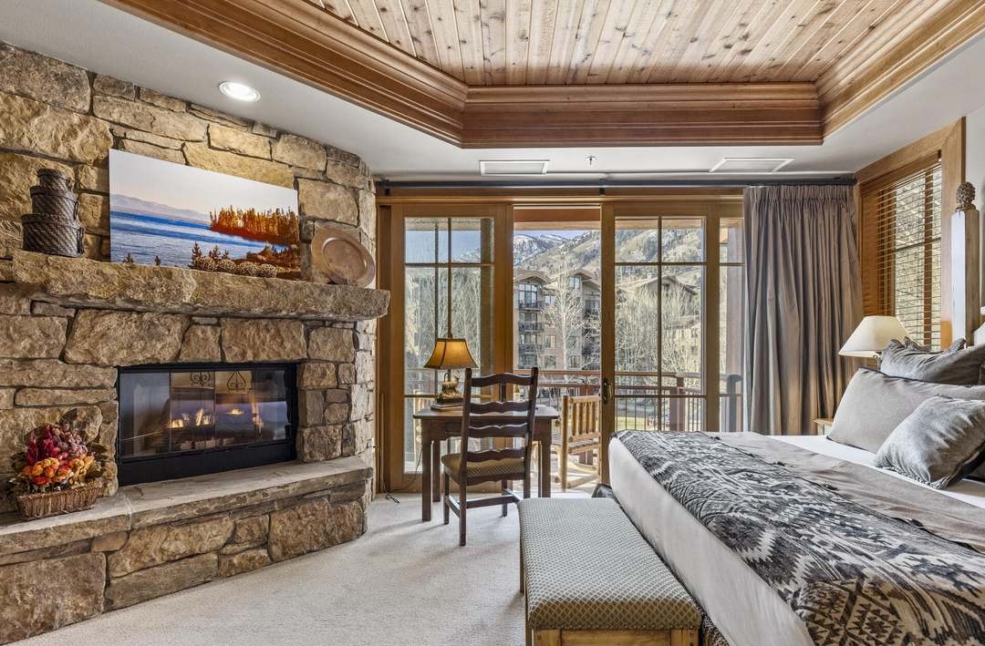 A stunning mountain_west primary bedroom suite featuring a dramatic stone fireplace, coffered wood ceiling, and expansive floor-to-ceiling windows framing spectacular alpine views. The design seamlessly blends organic materials with modern furnishings, creating a serene yet luxurious retreat with a private balcony and refined brass hardware throughout.