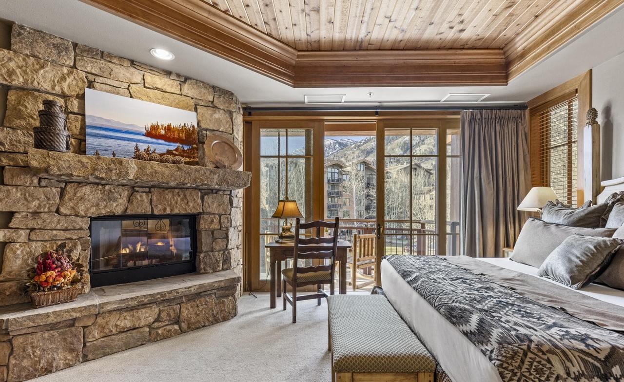 A stunning mountain-modern primary bedroom suite featuring a dramatic stacked-stone fireplace, rich wood coffered ceiling, and expansive glass doors framing mountainous views. The warm, layered palette of natural stone, wood, and textiles creates an intimate yet grand retreat combining alpine elegance with contemporary comfort.