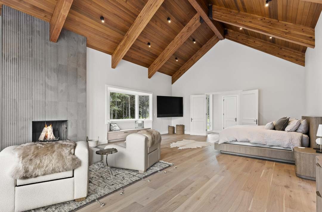 An exceptionally spacious primary bedroom suite bathed in natural light, featuring dramatic vaulted ceilings with warm timber beams, a modern fireplace with vertical corrugated metal surround, and abundant windows overlooking forest views. The design masterfully blends organic materials and warm neutrals with contemporary furnishings and clean lines, creating a sophisticated yet serene retreat.