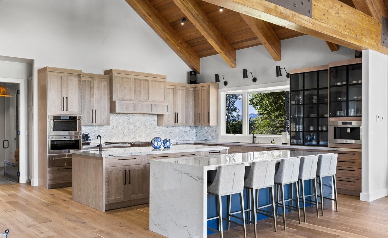 A stunning luxury kitchen showcasing mountain-west elegance with exposed timber beams, a dramatic waterfall island in Carrara marble, and a sophisticated two-tone cabinetry blend of light oak and darker woods. Floor-to-ceiling windows frame spectacular outdoor views while black hardware and track lighting provide contemporary contrast to the warm natural materials and neutral palette.