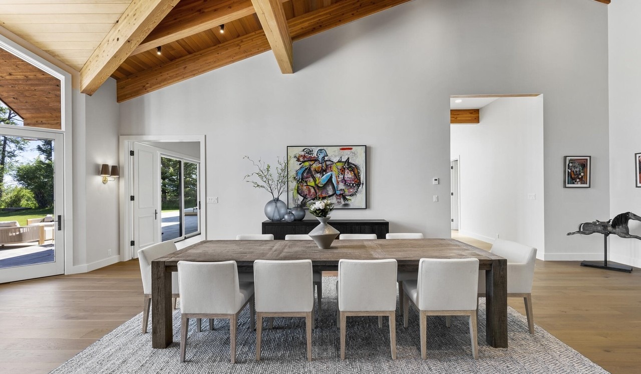 A luminous dining room exemplifying organic modern design, featuring a substantial reclaimed wood table paired with contemporary cream linen chairs, anchored by a hand-knotted neutral rug. The soaring vaulted ceiling with exposed timber beams, floor-to-ceiling windows framing manicured grounds, and carefully curated modern artwork create a sophisticated yet serene sanctuary that seamlessly blends rustic materiality with refined contemporary aesthetics.
