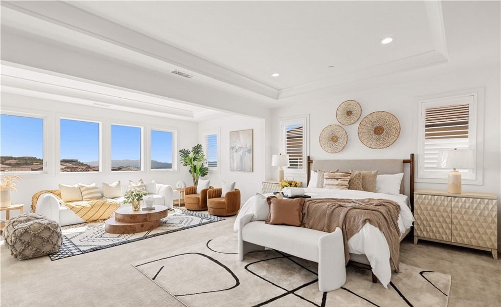A stunning primary bedroom suite with an open floor plan flowing into a lounge area, featuring abundant floor-to-ceiling windows offering panoramic views. The sophisticated palette of warm neutrals—creams, tans, and cognac—is anchored by coffered ceilings, natural wood furnishings, woven accents, and designer upholstery, creating a serene yet luxurious sanctuary with editorial-quality design.