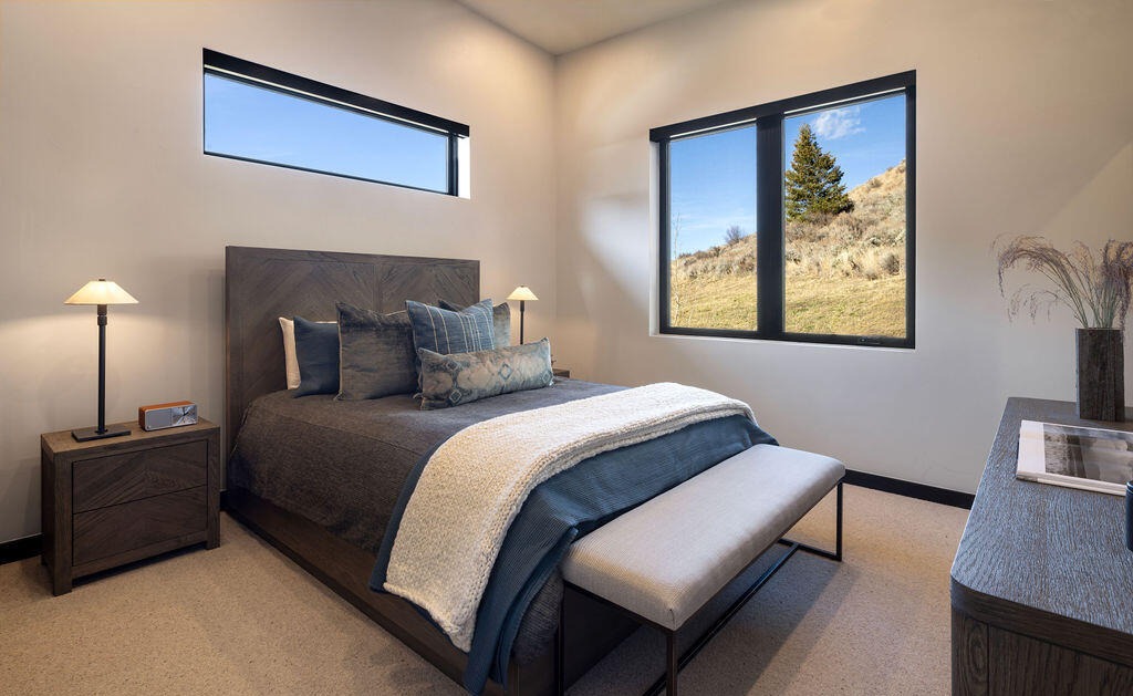 A sophisticated mountain-modern primary bedroom with expansive floor-to-ceiling windows framing dramatic hillside views, combining warm natural materials (dark wood furnishings, textured bedding) with clean contemporary lines and neutral earth tones. The space achieves luxury through refined simplicity, with statement table lamps, layered textures, and abundant natural light creating a serene, high-end retreat.