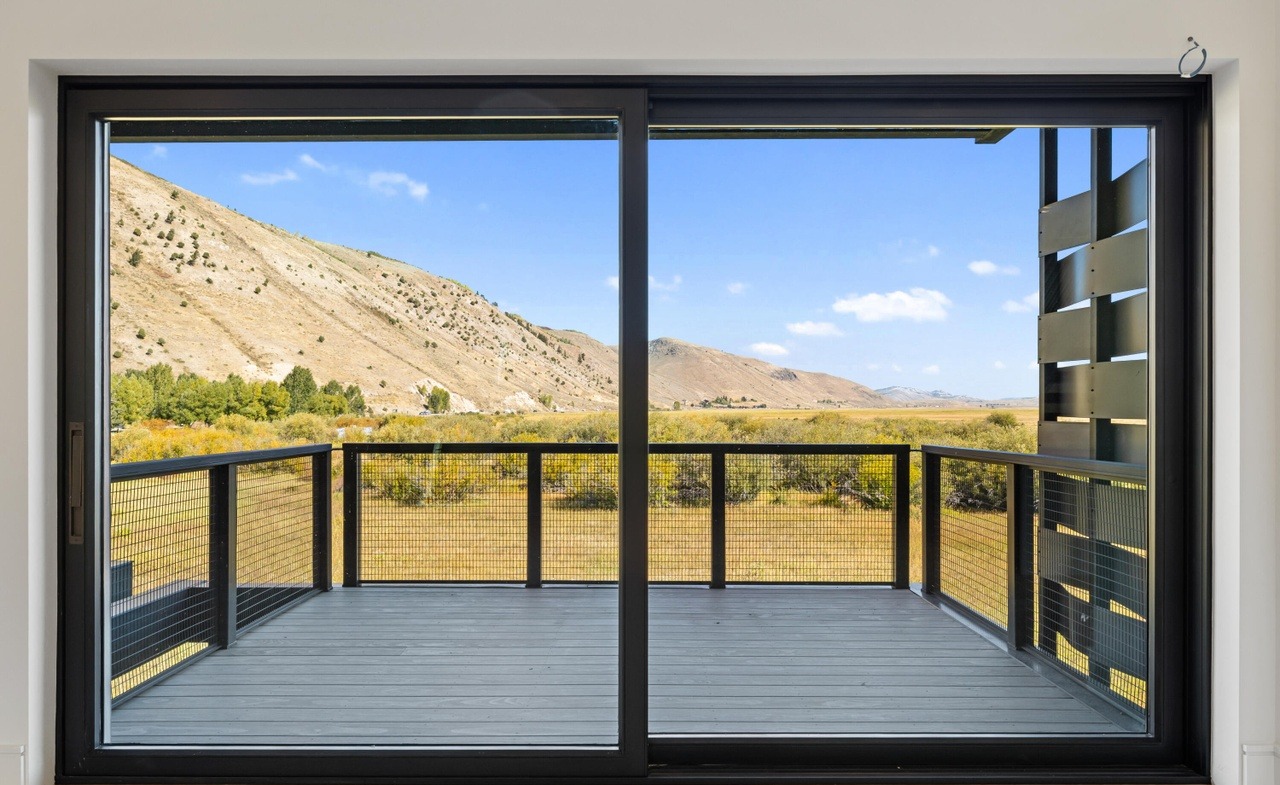 A sophisticated modern deck offering expansive mountain valley views through sophisticated floor-to-ceiling glass sliders, featuring a minimalist black steel railing with yellow-toned mesh infill and composite decking. The space exemplifies contemporary mountain living with clean lines, abundance of natural light, and a seamless indoor-outdoor connection framed by dramatic desert landscape and arid hillside topography.