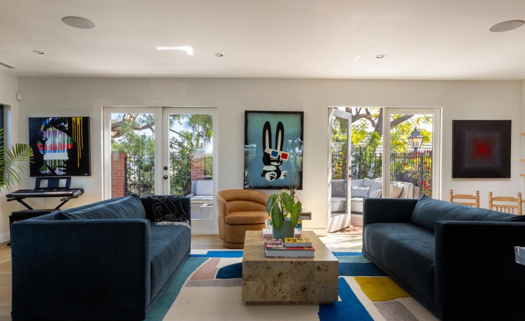 A bright, sophisticated open-concept living room featuring two navy blue modern sofas anchored by a sculptural concrete coffee table and vibrant geometric area rug in blue, rust, and yellow tones. Floor-to-ceiling glass doors and windows flood the space with natural light, connecting to an outdoor patio, while curated contemporary artwork and warm wood flooring create a refined, gallery-like atmosphere with accessible luxury.
