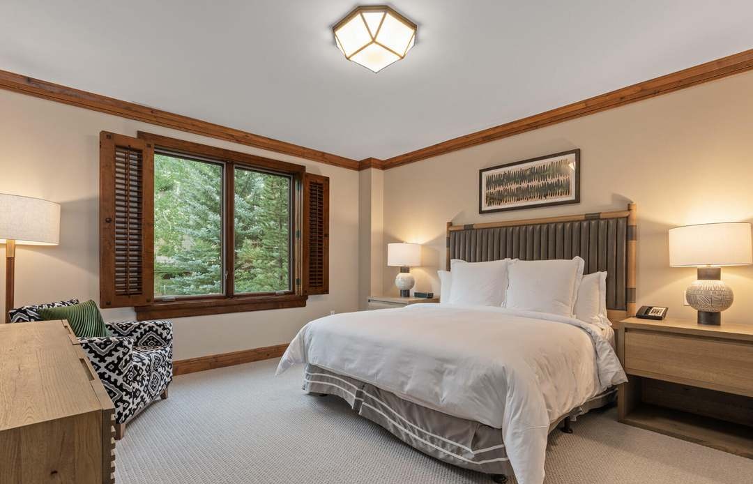 A serene primary bedroom featuring warm neutral tones, rich wood architectural details, and abundant natural light from forest-view windows. The sophisticated design balances traditional millwork and crown molding with modern furnishings and clean-lined contemporary lighting, creating a peaceful retreat with understated luxury.