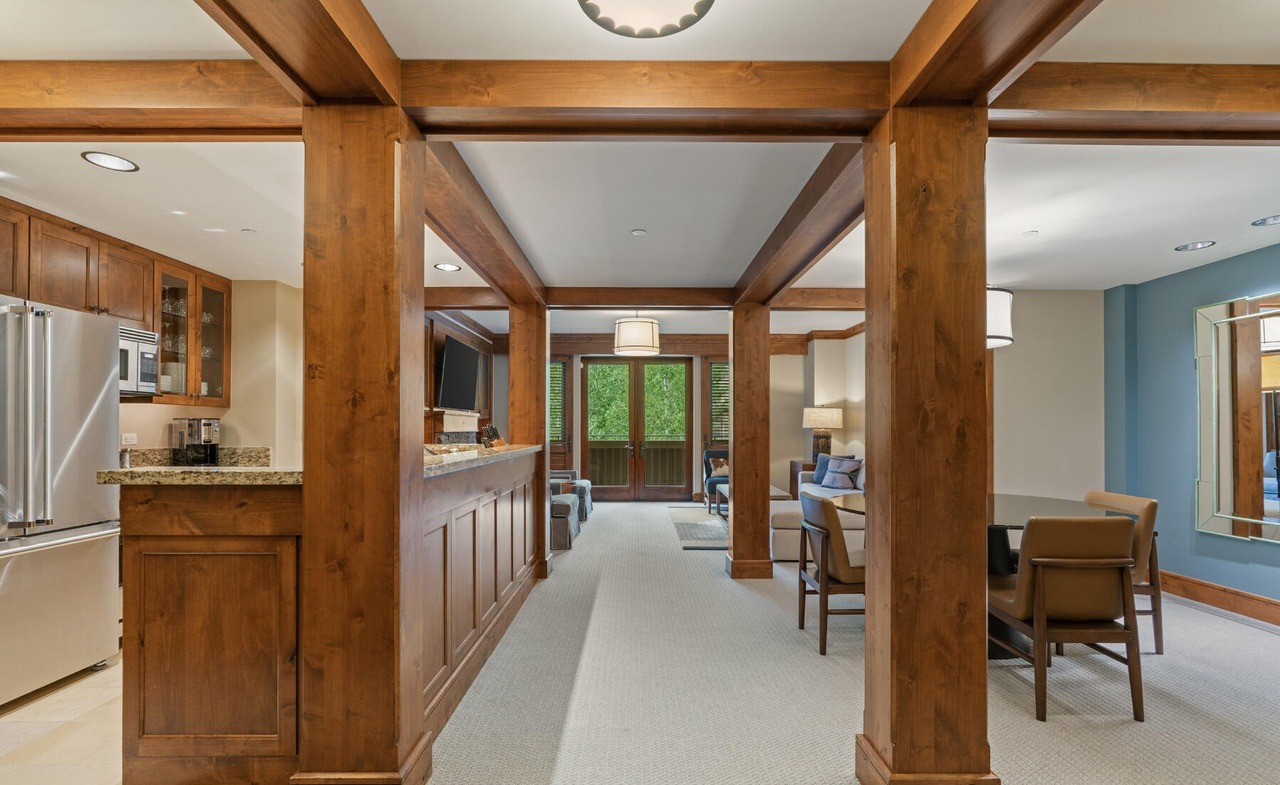 This sophisticated transitional hallway features dramatic exposed timber beams and custom wooden columns that anchor a light-filled great room connector. The warm wood architectural elements paired with cream walls, teal accents, and natural light from French doors create a luxurious yet inviting passageway that seamlessly blends traditional craftsmanship with contemporary comfort.