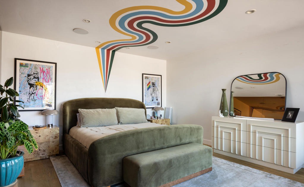 A sophisticated primary bedroom featuring a sculptural sage-green upholstered bed paired with crisp white custom millwork and warm hardwood flooring. The distinctive wavy multicolor ceiling artwork and curated abstract wall pieces elevate the space into gallery-like luxury, while the integrated dresser with mirror and modern styling create a resort-quality retreat.