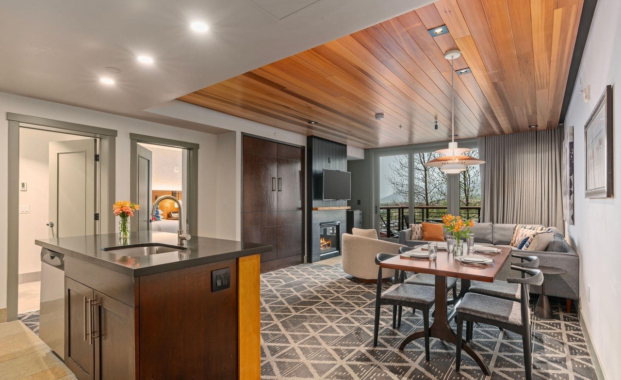 A sophisticated open-concept living space featuring a striking angled wood plank ceiling, panoramic mountain views, and a seamless blend of warm wood tones with neutral upholstery and patterned geometric flooring. The design showcases modern luxury with careful material layering, statement lighting, and a cozy fireplace that anchors an elegant seating arrangement.
