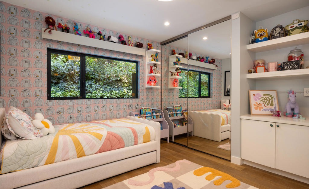A sophisticated children's bedroom featuring playful pastel-patterned wallpaper and abundant natural light from oversized black-framed windows, balanced by clean white built-in cabinetry and open shelving that display colorful toys and decor. The design demonstrates excellent spatial planning with mirrored elements, warm wood flooring, and a carefully curated color palette that feels both joyful and refined.