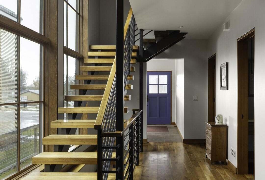 A striking contemporary staircase featuring warm oak treads paired with a sculptural black steel railing and brass accents, anchored by floor-to-ceiling windows that flood the space with natural light. The design seamlessly blends industrial and modern aesthetics with an open, airy quality enhanced by clean white walls and polished hardwood flooring.