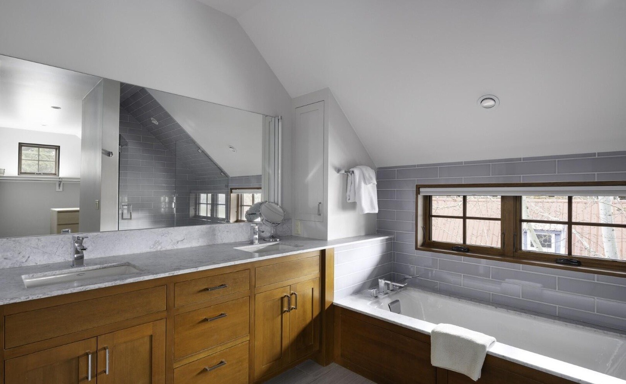 A sophisticated primary bathroom featuring a spa-like ambiance with warm wood cabinetry, marble countertops, and a frameless glass shower with subway tile surround. The vaulted ceiling with skylight and expansive windows flood the space with natural light, while the freestanding soaking tub and dual vanity create a luxurious retreat that blends transitional elegance with contemporary organic warmth.