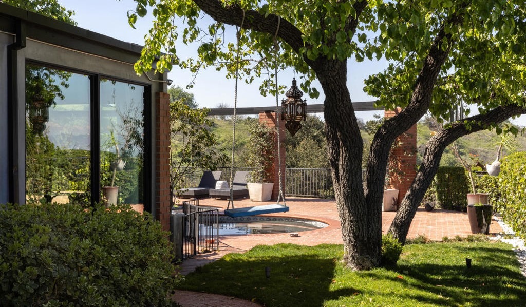 A sophisticated desert modern patio seamlessly blends indoor-outdoor living with a striking brick and terra-cotta aesthetic, anchored by mature shade trees and punctuated with contemporary furnishings and mountain views. The space balances natural materials, lush landscaping, and modern architectural elements—including large black-framed glass doors and a minimalist pergola—to create a serene yet luxurious retreat.