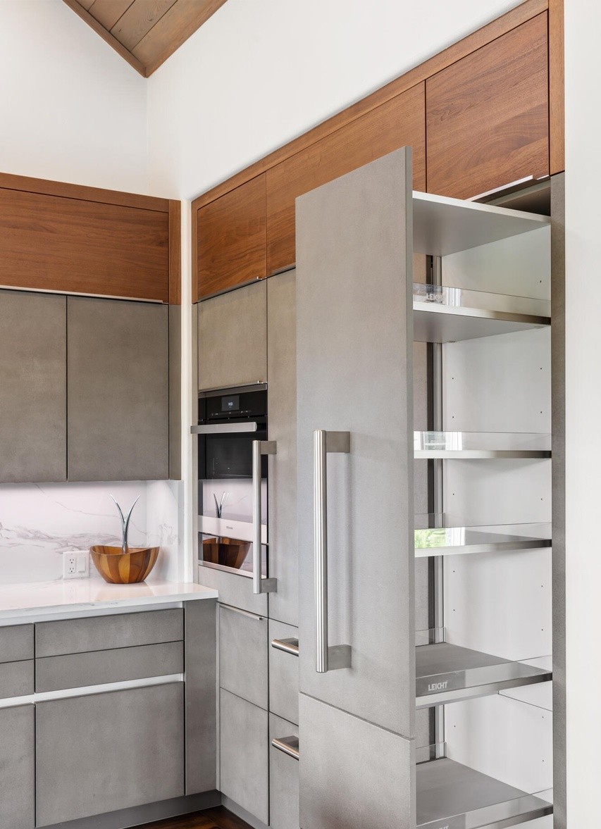 A sleek, minimalist kitchen featuring a sophisticated two-tone cabinet design with warm walnut upper cabinetry and soft gray lower cabinets, paired with open metal shelving and a clean white marble backsplash. The space exudes contemporary luxury through restrained materiality, integrated stainless steel appliances, and a vaulted ceiling with soft recessed lighting that creates an airy, serene atmosphere.