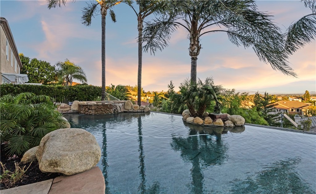 An ultra-luxurious infinity-edge resort-style pool set against a panoramic hillside vista, framed by dramatic tall palms and meticulously placed boulders that create an organic, natural aesthetic. The seamless integration of water feature, tropical landscaping, and golden-hour light creates a serene yet grandiose entertainment space that exemplifies high-end Southern California modern design.