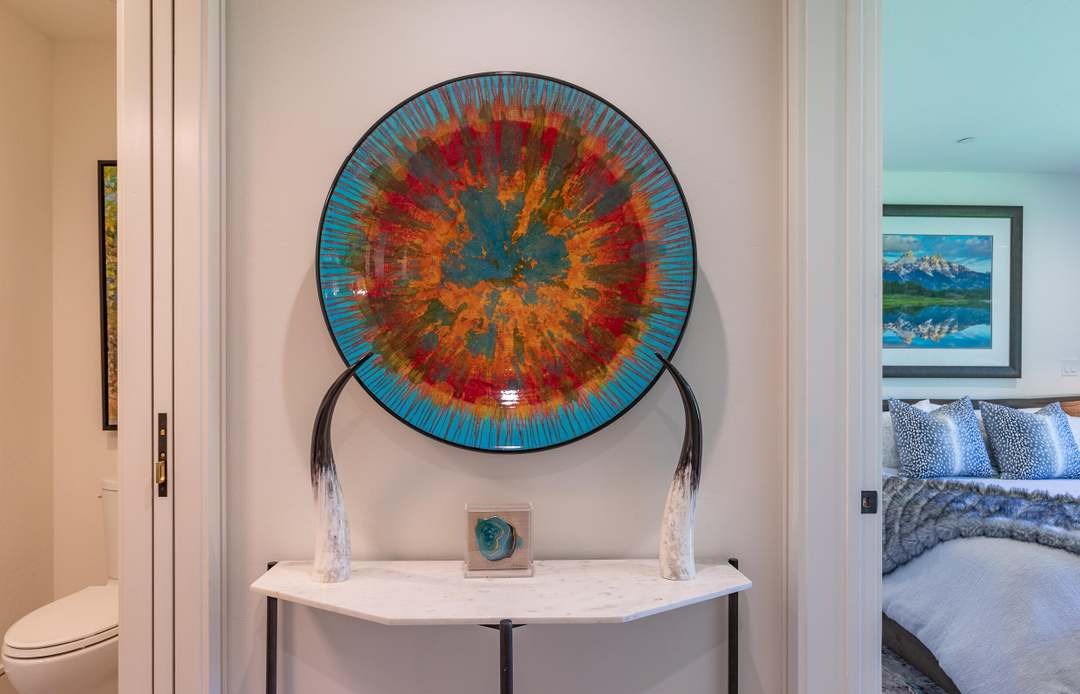 An exceptionally curated powder room featuring a stunning blue-and-rust radial statement art piece as the focal point above a marble floating vanity with black metal frame. The space balances artistic drama with refined minimalism, elevated by quality materials and thoughtful composition that transforms a utilitarian room into a gallery-like experience.