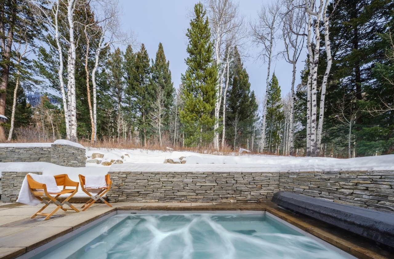 An exceptionally serene alpine hot tub retreat featuring a mortared stone surround wall with integrated seating, nestled in a snow-dusted mixed forest of aspens and evergreens. The design exemplifies mountain modern luxury with warm wood lounge chairs and minimalist spa aesthetics, creating an intimate outdoor wellness sanctuary with panoramic forest views.