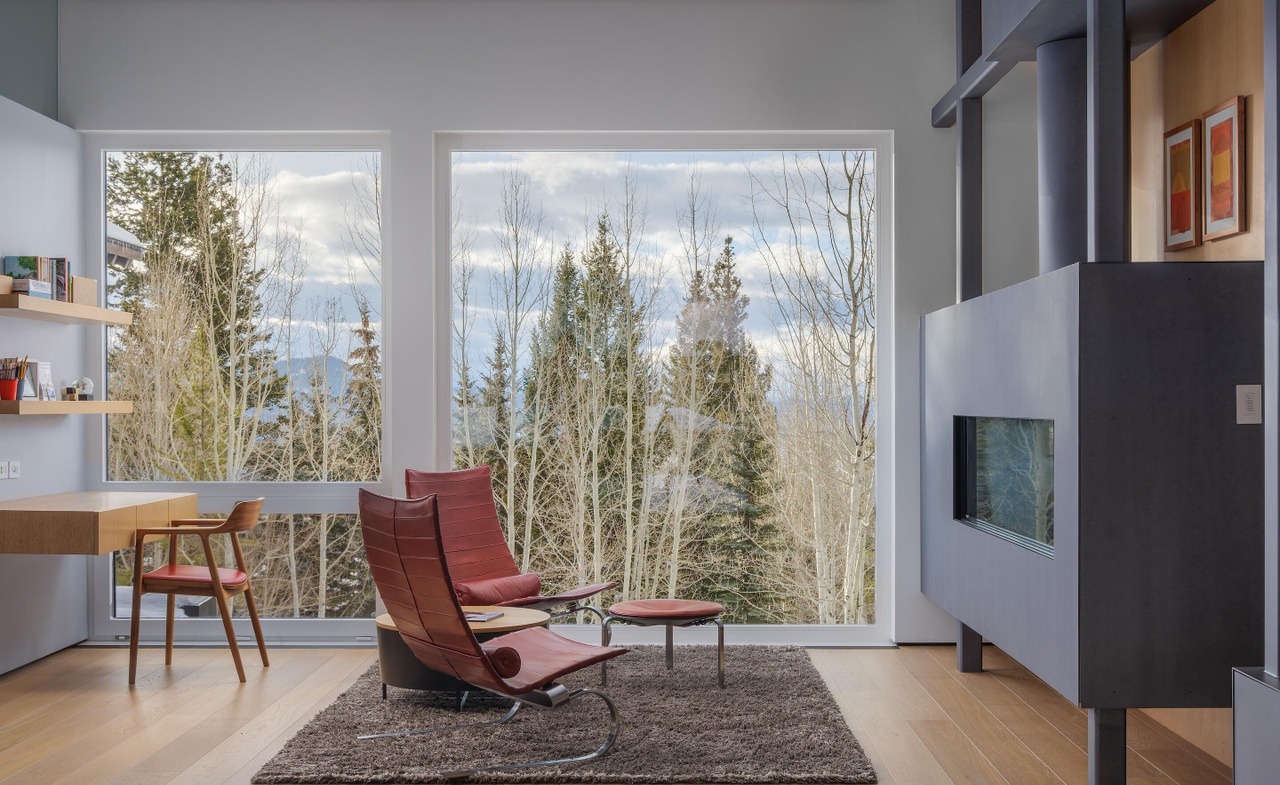 A sophisticated mountain-modern living space bathed in abundant natural light through expansive floor-to-ceiling windows framing pristine forest and mountain vistas. The room masterfully balances warm natural wood elements, clean architectural lines, and a curated mix of mid-century and contemporary furnishings, anchored by a burgundy leather lounge chair that adds warmth and visual intrigue to the serene, minimalist palette.