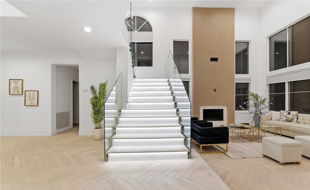 A stunning multi-level open-concept space featuring a sculptural white marble staircase with black metal railings as the architectural centerpiece, flanked by floor-to-ceiling windows and a warm wood-clad accent column. The expansive herringbone hardwood flooring, clean white walls, minimal furnishings, and abundant natural light create a sophisticated yet airy atmosphere that seamlessly integrates the staircase with the adjoining living area.