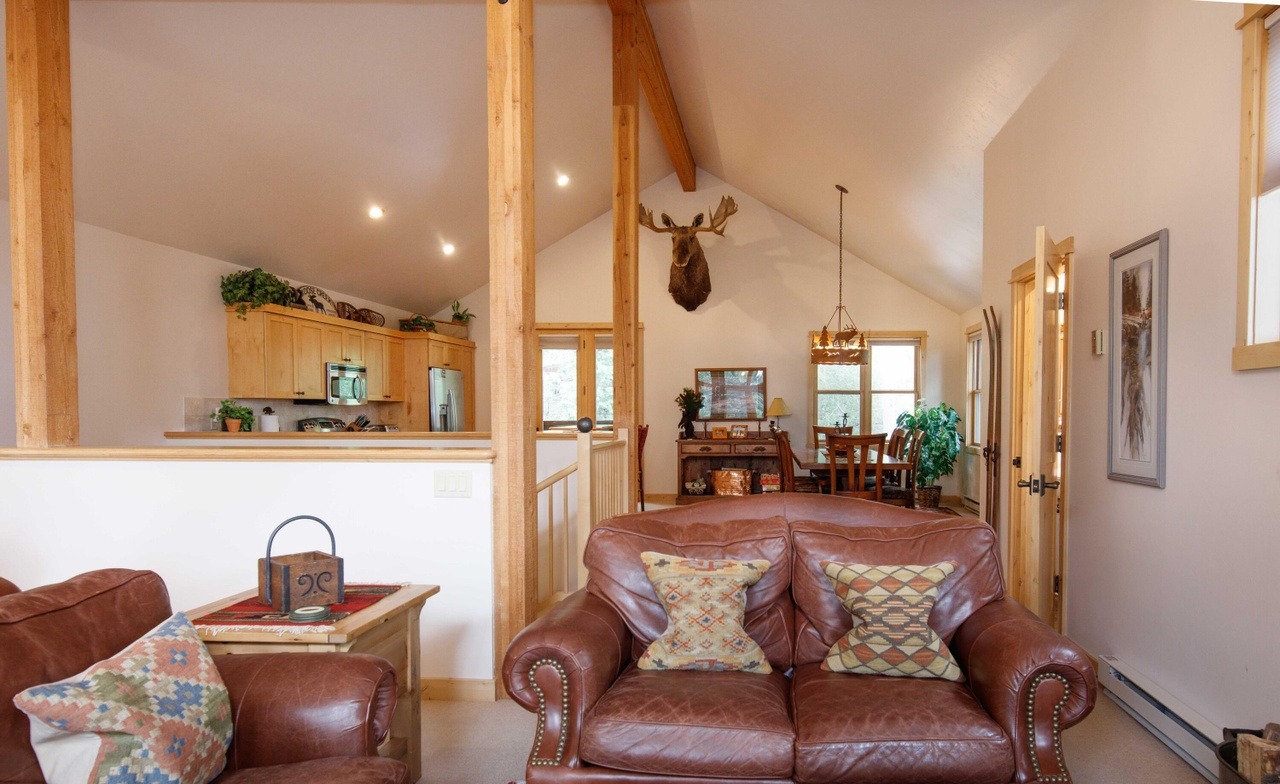 A stunning mountain modern great room featuring dramatic exposed timber framing, vaulted ceilings, and abundant natural light through multiple windows, anchored by rich cognac leather furniture and layered with warm earth tones and carefully curated accessories. The space masterfully blends rustic architectural elements with contemporary furnishings and refined styling, creating an inviting yet sophisticated lodge-like atmosphere.