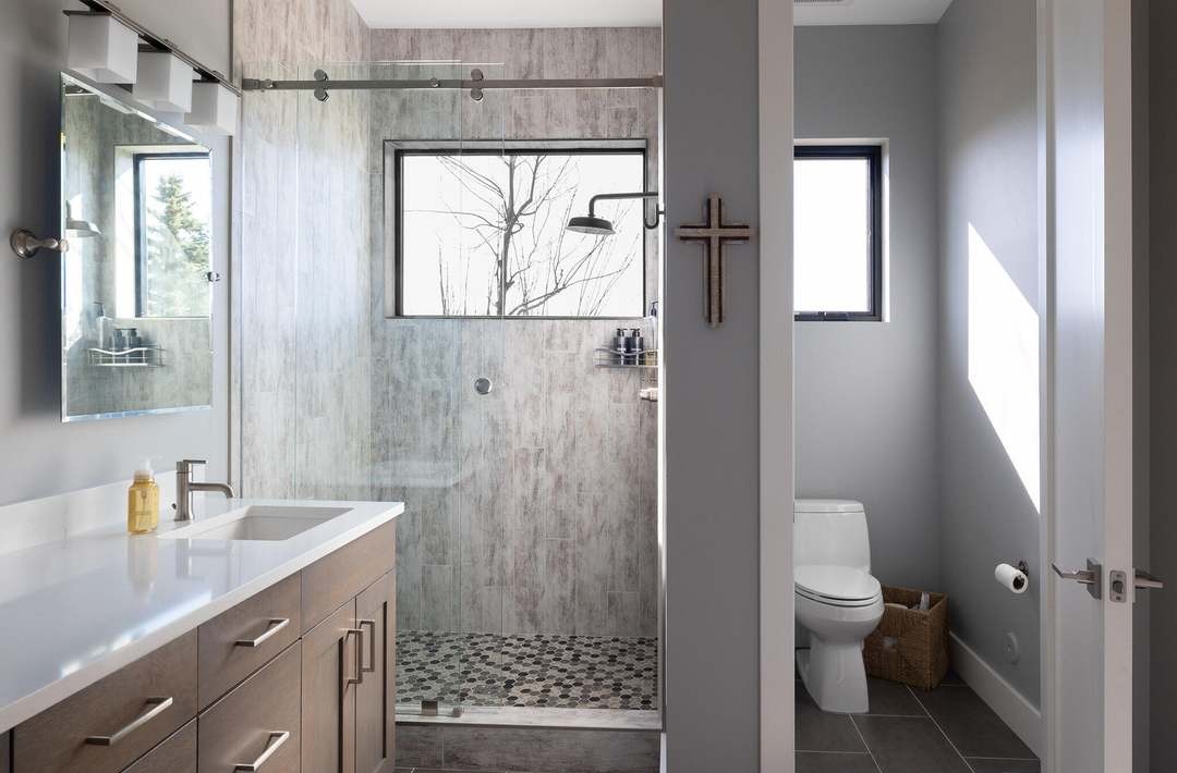Walk In ShowerFrameless Glass EnclosureFloating VanityDouble VanityLarge Format TileRain ShowerheadStatement WindowAbundant Natural LightPatterned Floor Tile