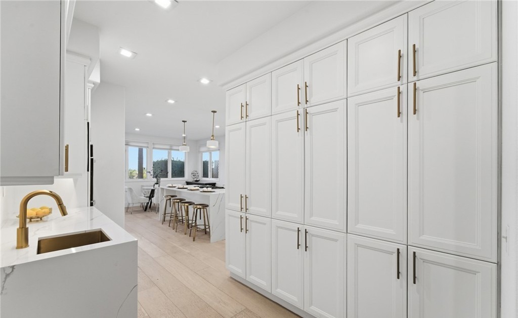 A light-filled, open-concept kitchen featuring floor-to-ceiling white shaker cabinetry with brass hardware and a clean quartz countertop, seamlessly flowing into a connected dining/living area with abundant natural light. The design balances contemporary minimalism with warm transitional details through brass accents, statement pendant lighting, and refined millwork, creating a sophisticated yet inviting culinary space.