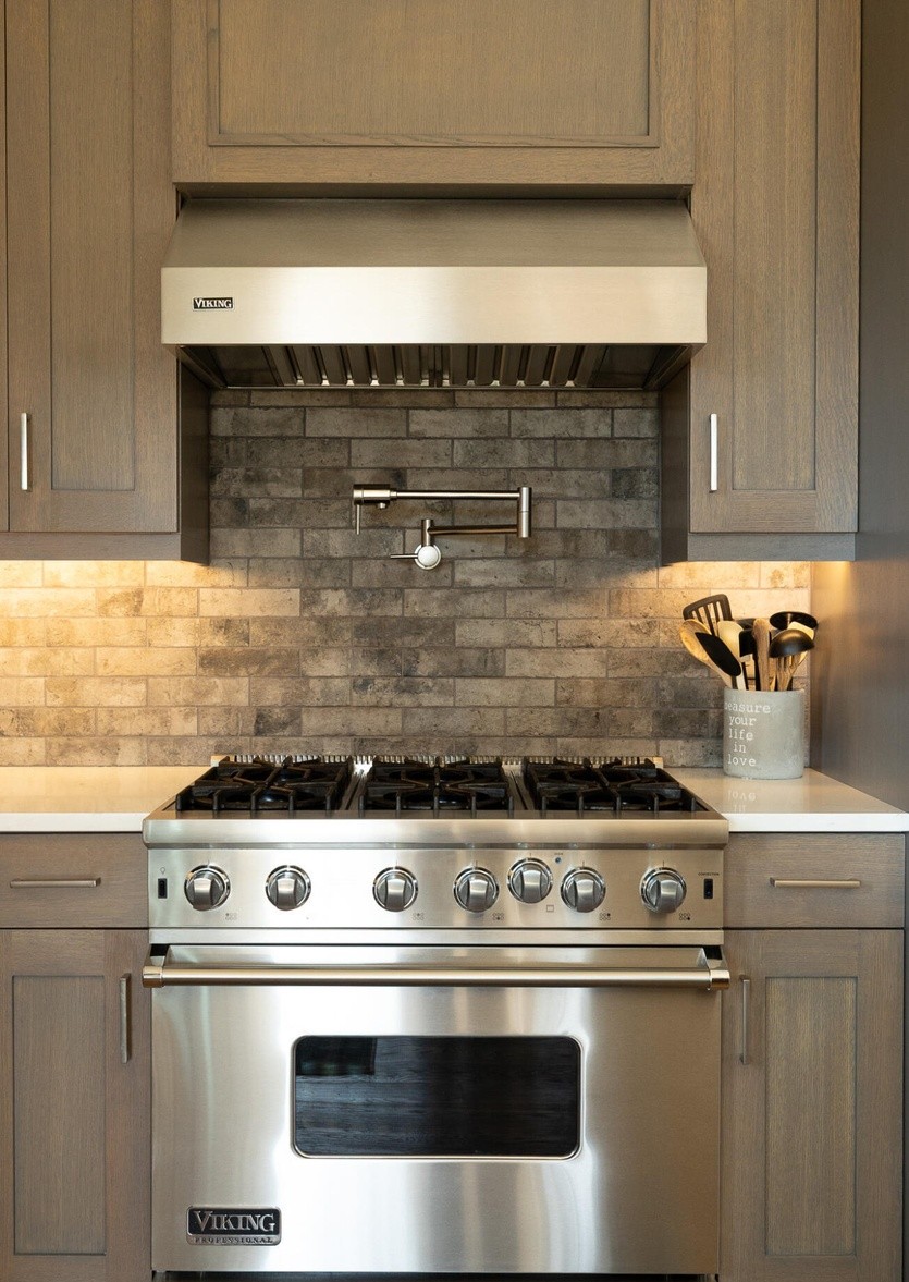 A sophisticated single-wall kitchen featuring a Viking professional gas range as the focal point, anchored by warm gray cabinetry with clean-line hardware and a dramatic charcoal stone tile backsplash. The design balances luxury appliances with transitional detailing—including crown molding and traditional paneling—combined with contemporary materials and understated elegance.