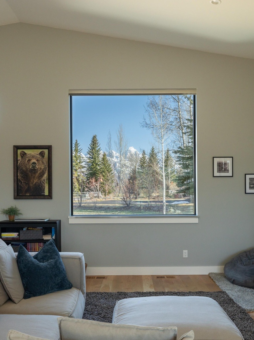 A sophisticated mountain-modern family room anchored by a dramatic floor-to-ceiling window framing snow-capped peaks and a river valley landscape. The warm neutral palette—creams, grays, and taupes—paired with natural wood furnishings and contemporary upholstery creates a serene, resort-like atmosphere that seamlessly connects interior comfort with pristine alpine views.