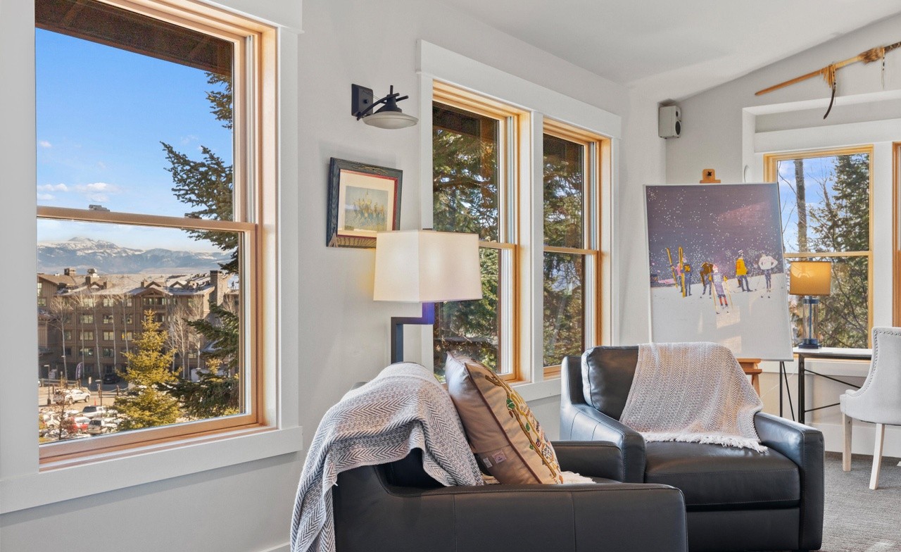 A stunning mountain-modern living space featuring floor-to-ceiling windows framing spectacular alpine and village views, with warm natural wood frames contrasting crisp white walls and cool gray tones. The room seamlessly blends organic materials—leather furnishings, knitted textiles, and natural wood accents—with contemporary minimalist design, enhanced by strategic purple and gold accent artwork and curated modern lighting fixtures.