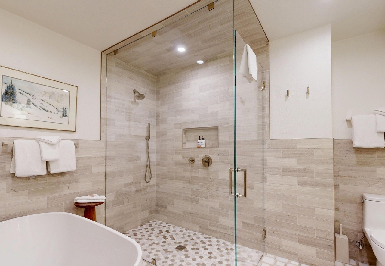 Freestanding TubWalk In ShowerFrameless Glass Shower DoorFloating ShelvingBuilt In NicheSkylightedRecessed LightingWainscoting Effect