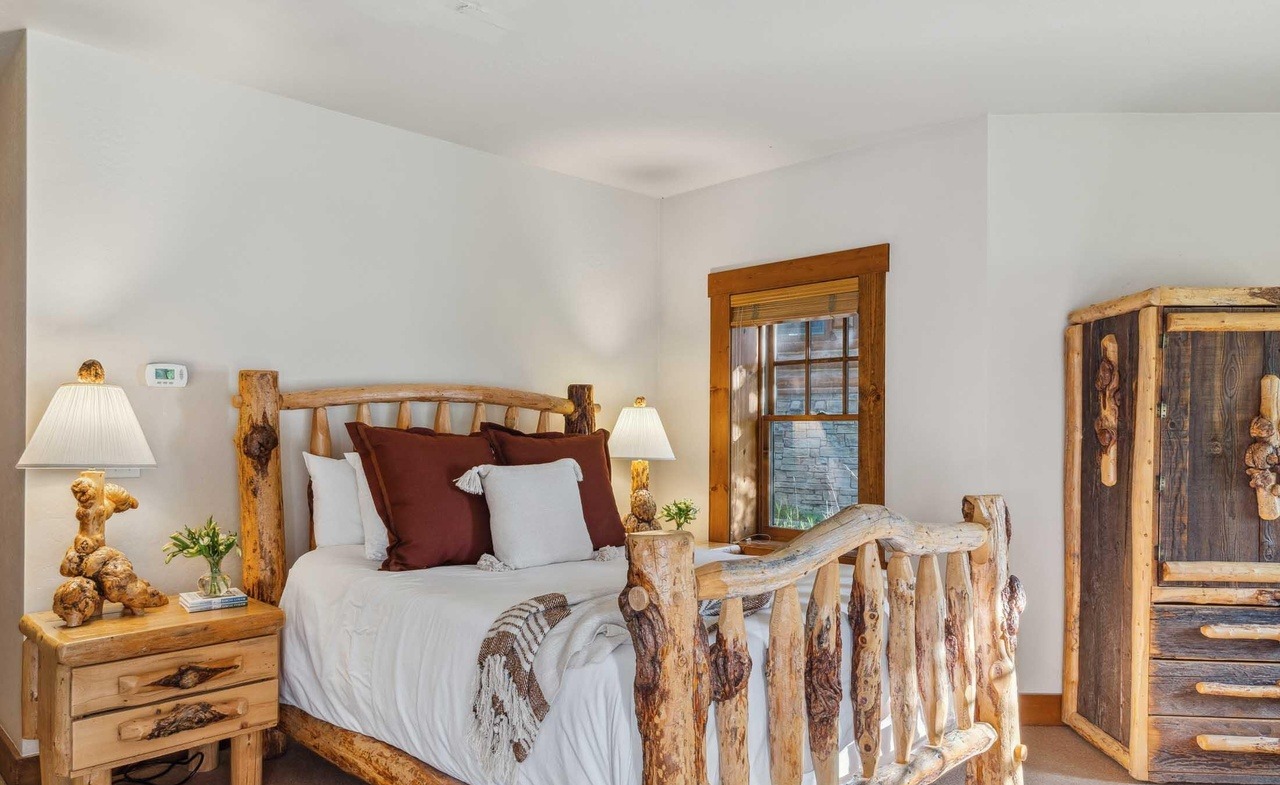 A stunning mountain lodge-inspired primary bedroom featuring a hand-crafted log bed with rustic timber posts paired with refined linens and brass accents, creating a sophisticated balance between raw natural materials and elegant comfort. The space exemplifies organic modern design through its warm wood palette, minimalist decor, and thoughtful lighting that emphasizes the distinctive architecture and craftsmanship.