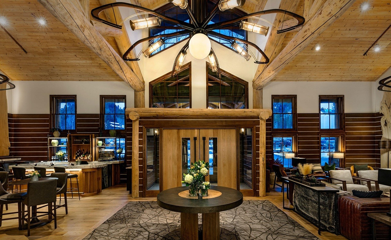 A breathtaking mountain-modern great room anchored by soaring cathedral ceilings with exposed timber beams and abundant skylighting, creating dramatic vertical emphasis and natural illumination. The sophisticated interior seamlessly blends organic natural materials—warm wood, stone accents, and high-end furnishings—with contemporary minimalist lines, featuring a sculptural black-top round table as the focal point and a dramatic statement chandelier overhead.