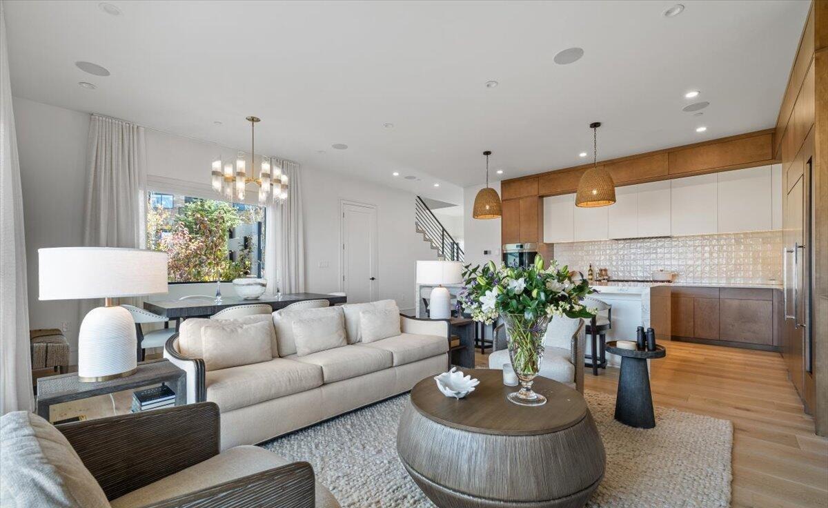 A sophisticated open-concept living room seamlessly integrated with a modern kitchen, featuring abundant natural light, warm wood tones balanced against crisp white cabinetry, and striking brass pendant lighting. The space exemplifies refined organic modern design with premium furnishings, layered lighting, and carefully curated natural materials creating an effortlessly luxurious atmosphere.