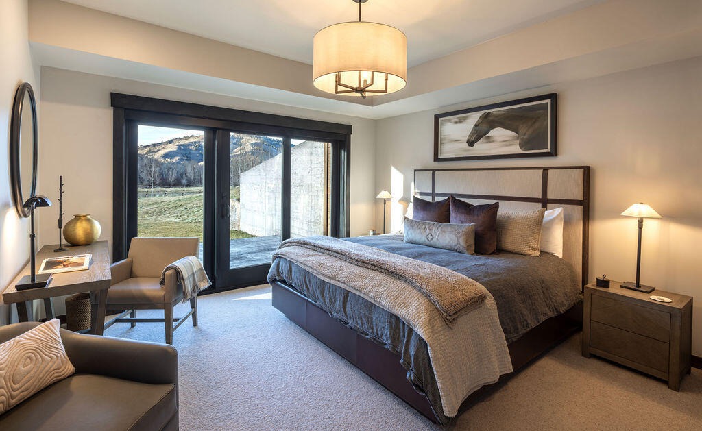 A stunning mountain-view primary bedroom featuring clean transitional design with organic warmth, anchored by a wooden-framed bed, soft neutral palette, and dramatic floor-to-ceiling windows overlooking alpine terrain. The tray ceiling, statement pendant lighting, and layered textures create a serene, resort-like sanctuary that balances modern sophistication with natural comfort.