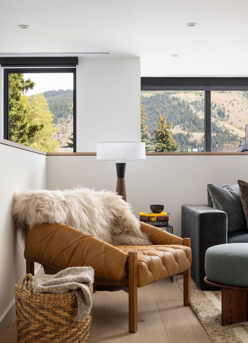 A sophisticated mountain retreat living room featuring floor-to-ceiling windows framing breathtaking forested hillside views, anchored by a luxurious cognac leather lounge chair with sheepskin accent and warm wood details. The space masterfully blends organic modern aesthetics with mountain modern sensibilities through natural materials, warm earth tones, and carefully curated furnishings that balance comfort with contemporary design.