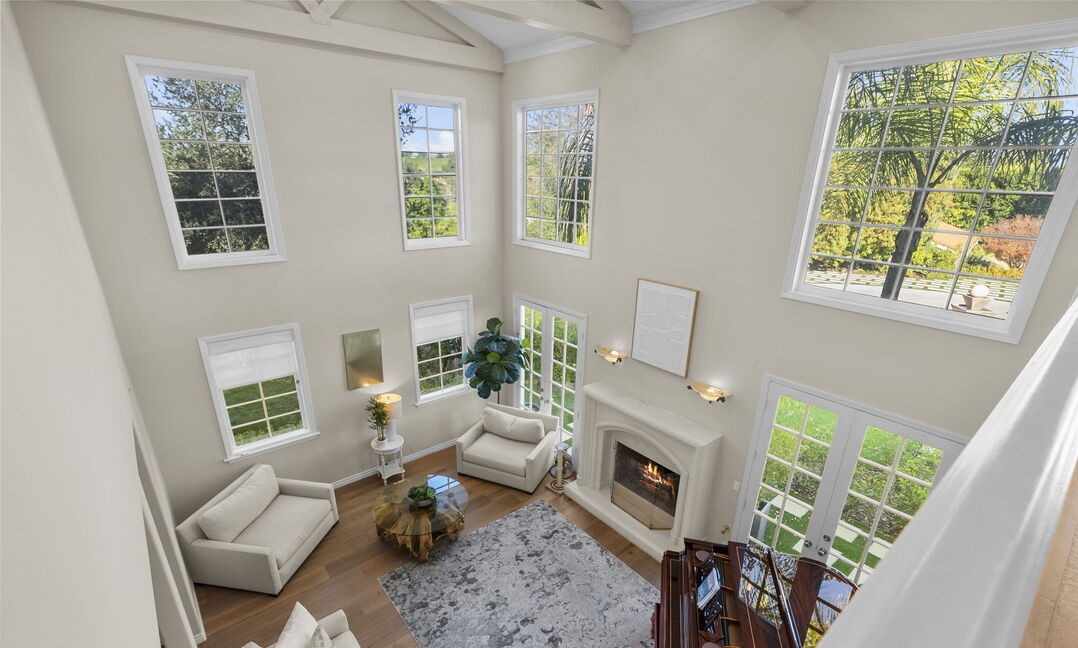 A stunning two-story living room featuring cathedral ceilings with exposed white beams and an abundance of white-framed windows that flood the space with natural light. The room balances architectural grandeur with a serene, neutral palette anchored by a modern fireplace and natural wood accents throughout.
